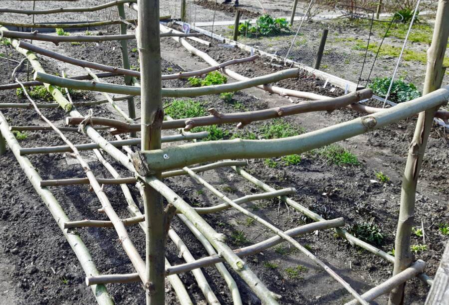 Bijna ieder dahlia heeft steun nodig. In een seizoen kunnen ze tot flinke struiken uitgroeien en het zijn vooral de wat hogere dahlia’s die het dan zwaar hebben. De bloem kan niet alleen topzwaar worden maar ook regen en wind kunnen boosdoener zijn en je hele plant plat gooien. Je kan werken met 1 of meerdere bamboestokken en zorgen dat de plant rondom steun heeft. Bij meerdere dahlia’s ben je daar behoorlijk druk mee en moet je vaker checken en extra stokken plaatsen. Een andere mogelijk is te steunen met kant en klare producten zoals plantensteunen of longstakes van De Wiltfang. Dit is wel een wat duurdere oplossing. Ik plaats al mijn dahlia’s in een bed en steun dat op een natuurlijke wijze met snoeitakken uit de wal van onze moestuin. Vaak liggen er ook wel wat takken in het groenafval van de gemeente.