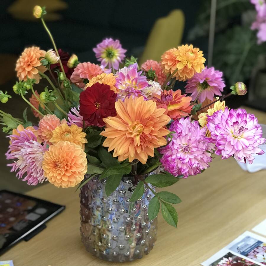 Deze bijzondere bloem springt in het oog en verrast ons met haar kleuren spektakel tot soms wel in november. En … de dahlia is onmisbaar voor de pluktuin. Daarom even wat meer informatie over dit knolgewas die wel wat extra aandacht kan gebruiken. Deze plant is momenteel erg gewild en weer helemaal terug van weggeweest. De dahlia is wel 500 jaar oud en komt oorspronkelijk uit Mexico. Hij is er in verschillende hoogte van 25 cm tot wel 200 cm en kan zowel in de pot als in de volle grond gekweekt worden. Om deze in je pluktuin neer te zetten is het belangrijk om een aantal zaken te weten. Allereerst is de dahlia vorstgevoelig en wordt normaal gesproken in het najaar uit de grond gehaald (gerooid). Ten tweede zijn er heel heel veel soorten waaronder grootbloemige. Deze zijn zo groot dat ze niet altijd even mooi staan in een boeket. Je kan als dahliafan heel goed een bos neerzetten met alleen grootbloemige dahlia’s maar persoonlijk vind ik sommige te groot om te combineren in een plukboeket. Wist je sommige dahliabloemen wel een doorsnede van 30 cm kunnen bereiken? We noemen deze niet voor niets “dinnerplate” dahlia’s. Kies daarom voor de iets kleinere soorten die heel goed te matchen zijn met je andere bloemen in het plukboeket.
