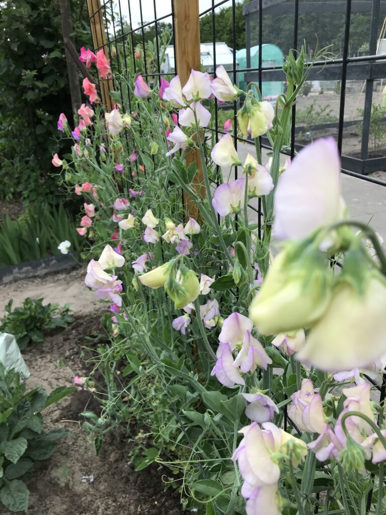 Als de Lathyrus eenmaal aan het groeien slaat dan kun je alleen maar wachten op de eerste bloemen. In 2020 was ik in februari begonnen en waren er eind mei al bloemen. Maar een vroege bloei betekent ook dat de planten eerder stoppen met bloemen geven. Je kunt het bloeiseizoen verlengen door een deel voor te zaaien en een deel later in de volle grond te zaaien. Als de eerste bloemen zich laten zien kun je gaan plukken. Dit moet ook, omdat de lLathyrus dan weer nieuwe bloemen aanmaakt. In de lathyrus mogen geen peulen zitten. Dat zijn de uitgebloeide bloemen die zaden gaan vormen. Hier gaat de plant zijn energie in steken. Als je van vakantie terug komt of even geen tijd hebt om te plukken dan kan je het beste alle oude bloemen en peulen afknippen. Tussendoor een keertje bemesten kan geen kwaad en als de bloemen van het klimrek los komen dan kan je die weer even vastzetten. Geef voldoende water aan de voet van de lathyrus. In de zomer loop ik er wel twee keer per week met een gieter langs.