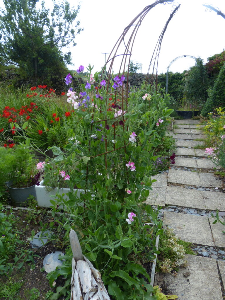 Lathyrus kan niet zonder steun behalve speciale Lathyrus in potten die lager blijven. Een klimsteun kun je maken van palen met rekken, pantanet gaas, een enkele paal in de border of een wigwam van natuurlijke houten takken of palen uit het hout- of snoeiafval. Je kunt gewoon kijken wat bij je past. Zet de steunen of rekken altijd achter in je border zodat deze alle zon pakt en geen schaduw geeft aan je planten die in de buurt staan. Ik combineer mijn Lathyrus met een dahliabed. Als de dahlia’s in juli beginnen met bloeien is in augustus de Lathyrus al op zijn retour.